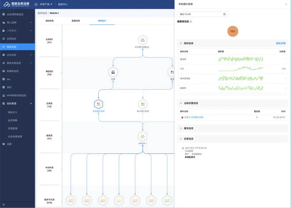 監控狀態管理方面,雲智慧支持對業務服務器、數據庫、中間件等離散的系統資源統一納管,全年365天7*24小時實時展示各項資源和應用系統的整體運行情況。可基於系統架構構建系統資源的層級化拓撲, 便捷查看上下依賴關係,例如應用所依賴的容器、虛擬機。此外,拓撲節點的顏色展示了各對象的健康程度,使原來錯綜複雜的運維管理工作變的簡單和輕鬆。