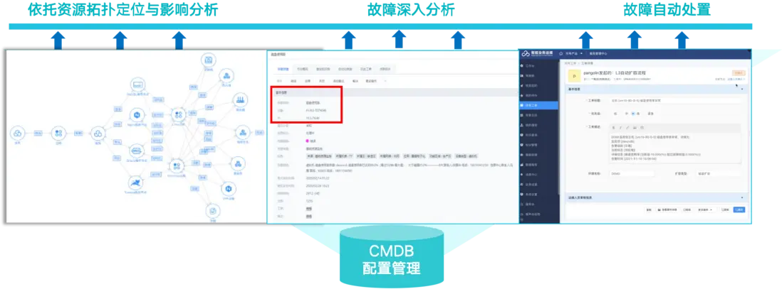 資源配置管理方面,配置資源圖譜故障場景主要是依託CMDB的層級拓撲,對故障CI進行定位。打通事件與CMDB,將CMDB中的相關CI關鍵屬性信息,如IP地址、主機名、應用標識、負責人、電話、資源的所屬位置等相關信息豐富到告警事件中,加強告警的易讀性和準確性。此外,通過告警生成工單,在處置過程中通過關聯CI保障數據的準確性,對故障進行閉環管理,加強CMDB配置數據的流動性和唯一性。最終實現通過配置資源圖譜拓撲可視化能力,幫助運維人員對故障進行根因分析、故障自動處置,以快速恢復業務。需注意,CMDB的資源層級拓撲與DOEM的互通,另一方面通過DOSM做資源的管控,保障數據的準確性以及對故障進行閉關管理。