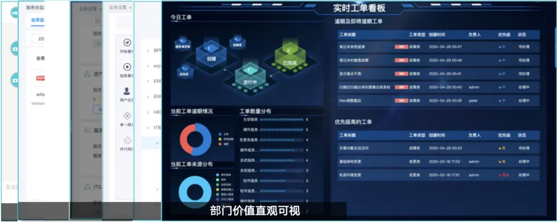 - 工單看板:對IT服務管理中涉及到的各類工單數據進行直觀監測,實時展示服務風險點、服務質量、服務效率以及服務水平,幫助管理層從全局視角對IT服務的質量進行感知與管控。