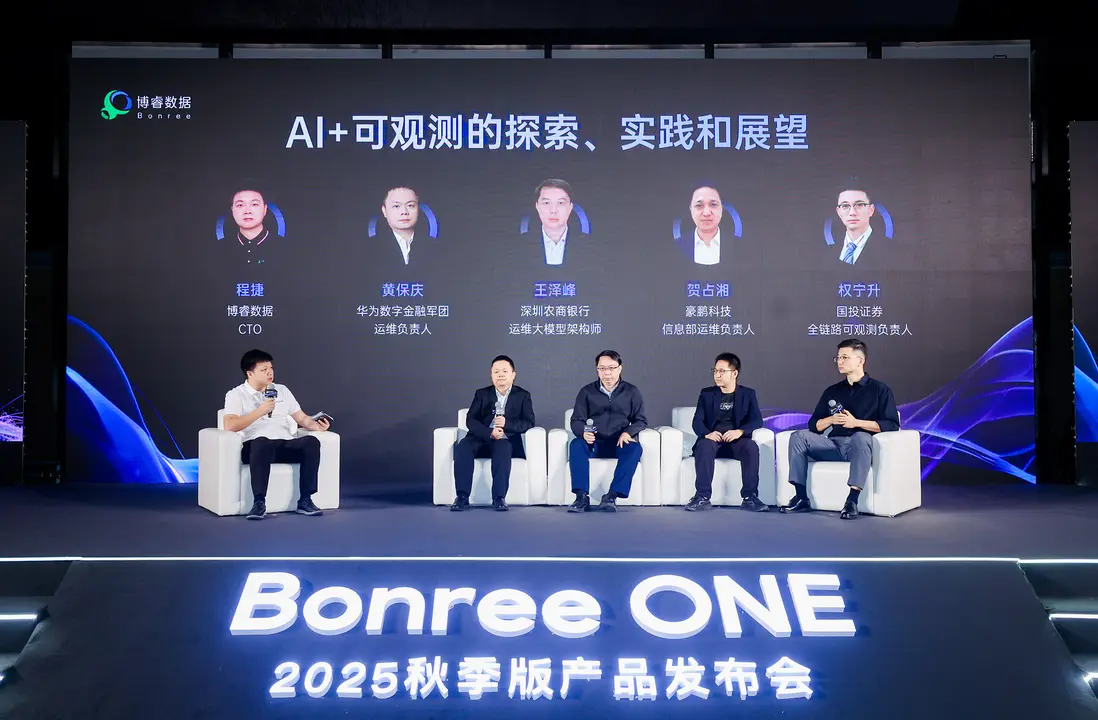 近日,在博睿數據“Bonree ONE 2025秋季版全球產品發佈會”的圓桌論壇環節,業界技術領袖齊聚一堂,圍繞以上行業痛點以及“AI + 可觀測的探索、實踐和展望”這一話題展開深度對話。圓桌論壇由博睿數據CTO程捷主持,特邀四位來自金融、製造等關鍵領域的技術領袖,共同探討了AI+可觀測性在實戰中的應用價值與未來圖景。