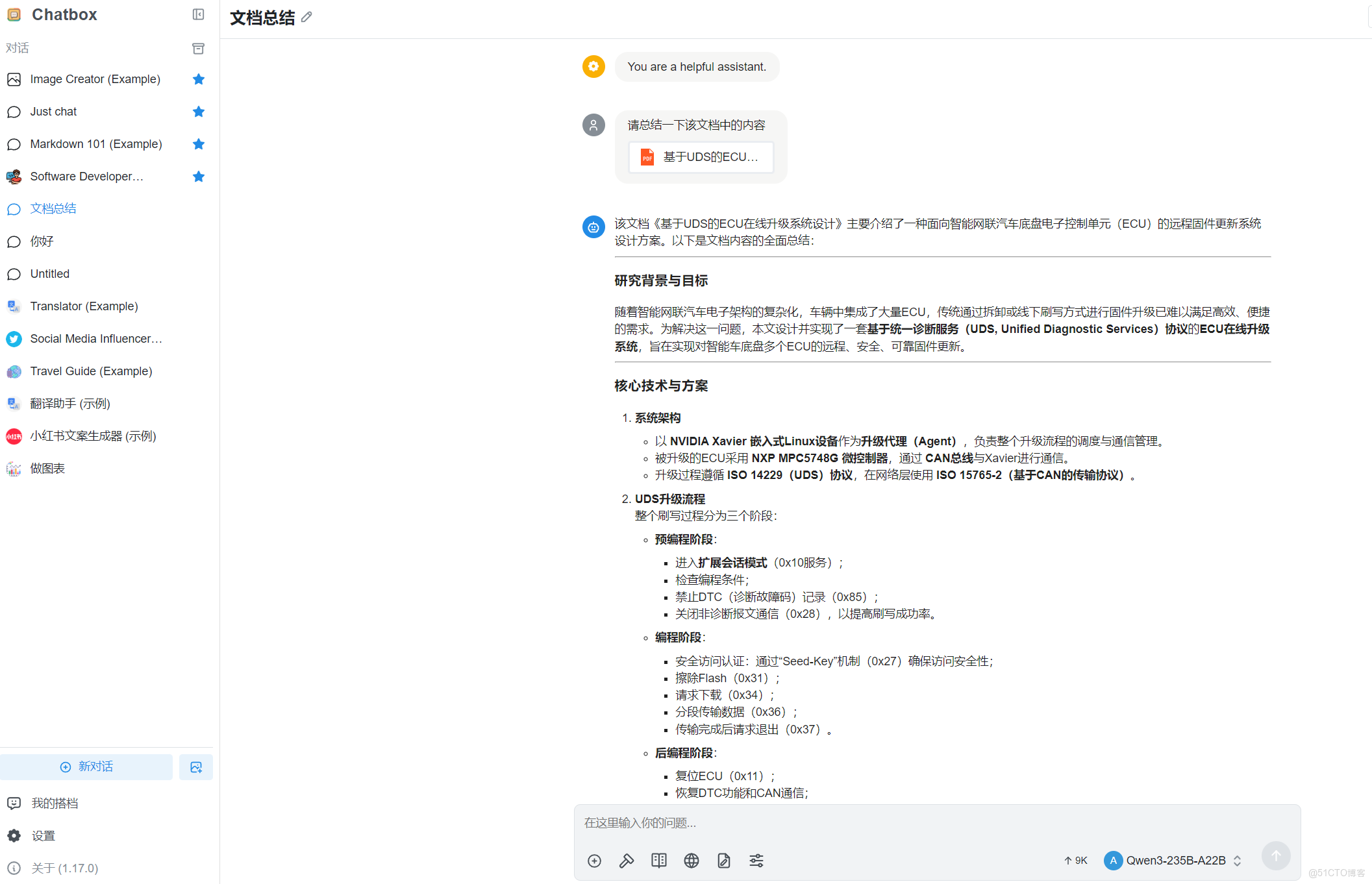 在chatbox輸入框中選擇一個文檔,讓大模型幫我們總結文檔的內容,運行效果如下: