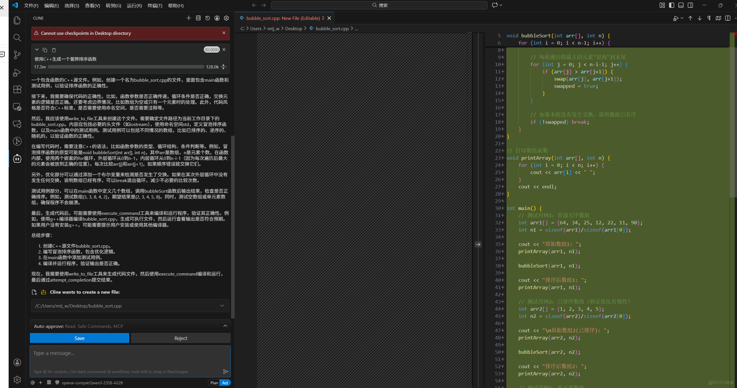 我們讓大模型使用C++生成一個冒泡函數。以下是運行效果: