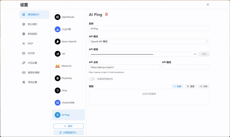 https://aiping.cn/api/v1 - OpenAI Compatible API Key: 填寫在2.2節獲取到的AI Ping的 API Key
