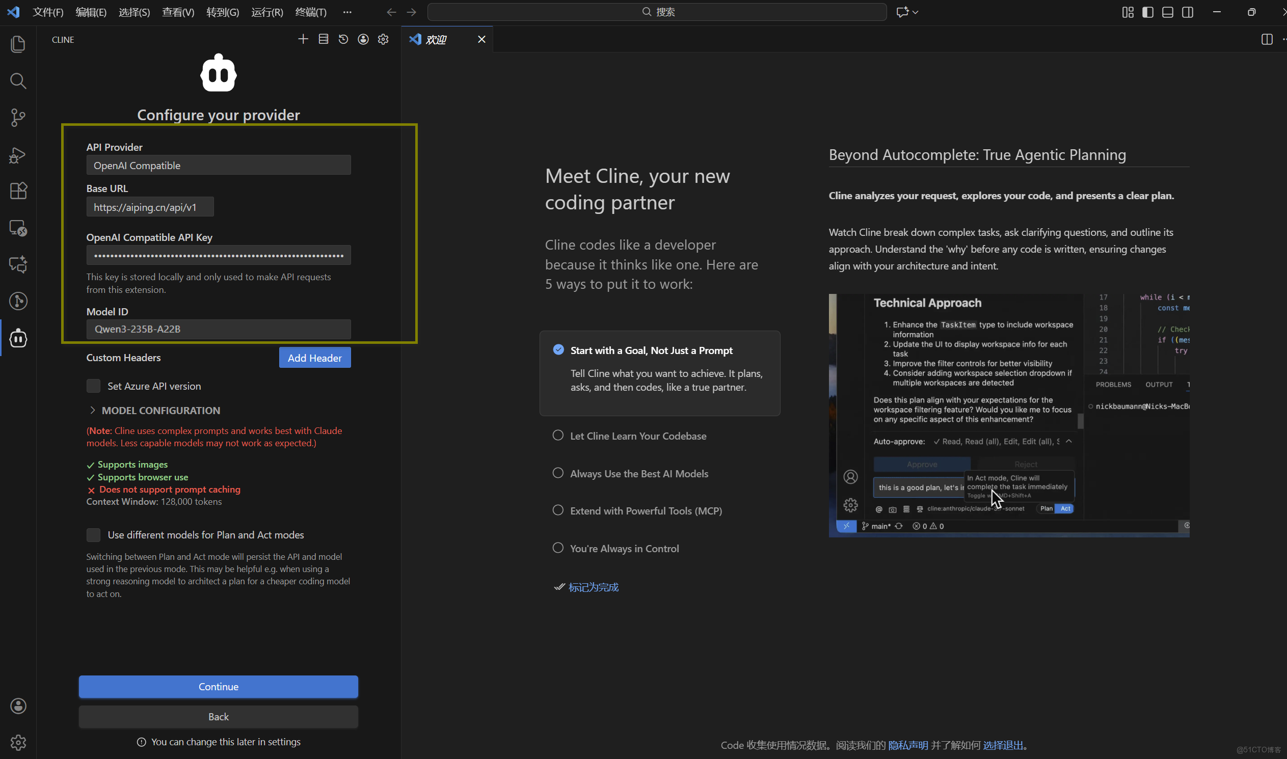 第一次使用會默認進入Cline的配置界面,也可以通過點擊Cline圖標後點擊Cline界面右上角設置按鈕進入配置界面,我們在Cline的配置界面選擇第三個bring my own API key(下圖中②的位置),然後點擊continue進入配置界面。