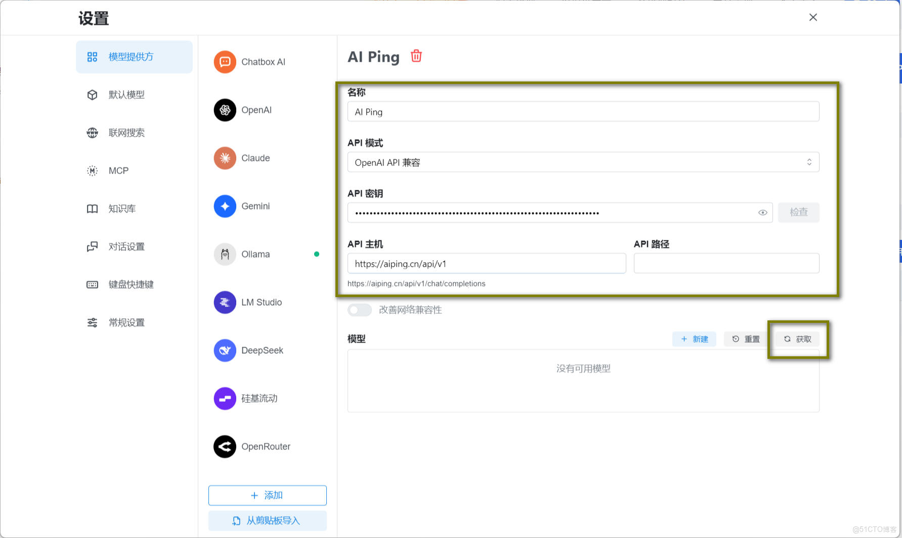將AIPing的Base url和API key分別填入API主機和API密鑰輸入框中。