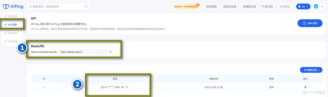 https://aiping.cn/api/v1 - 秘鑰,即位置②處以"QC-"開頭的一串字符。