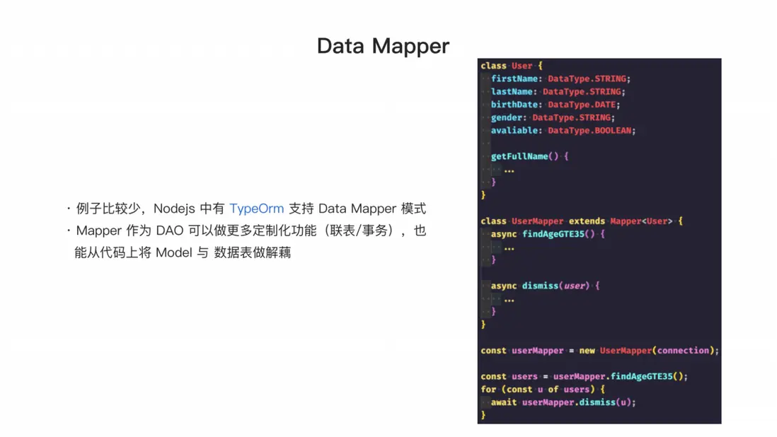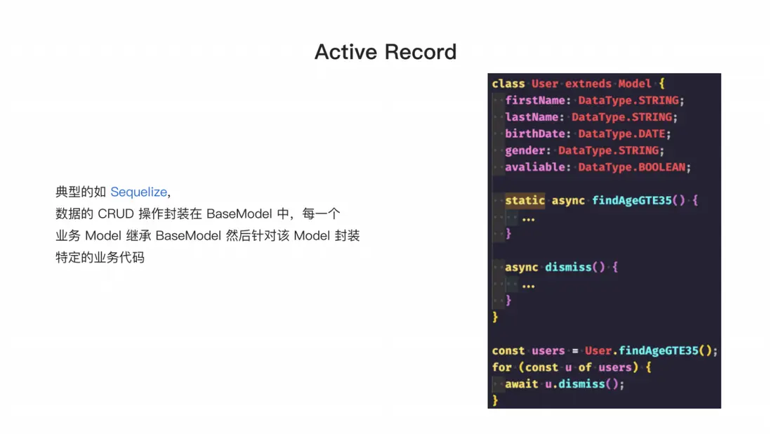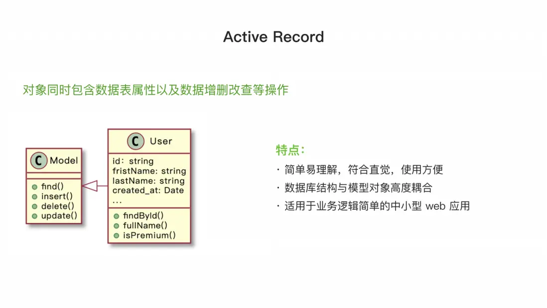 接下來介紹兩種常見的 ORM 模式:Active Record 和 Data Mapper。Active Record 翻譯成中文就是主動記錄模式,是一種架構模式。之前展示的 ORM 是 Active Record 模式的。