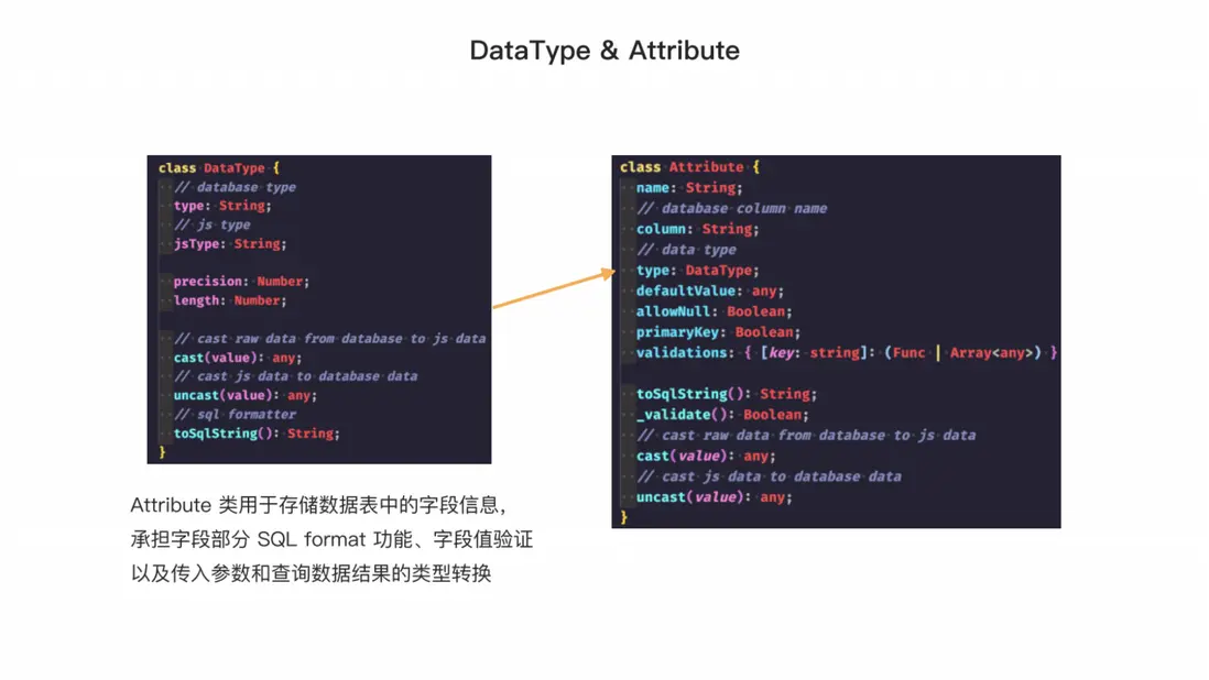 DataType(數據類型)主要用於表現數據類型,作為 JS 基礎類型與數據庫數據類型的橋樑,記錄了數據庫類型和對應的 JS 數據類型,並能在兩種語言之間轉換數據類型。它還需要表達該類型的 SQL,例如,如果數據類型是 integer,在 MySQL 中表現是什麼樣子的,在 post Grace 或 circulate 中表現又是什麼樣子的類型。這樣,最小的 ORM 最小單位類就成型了。