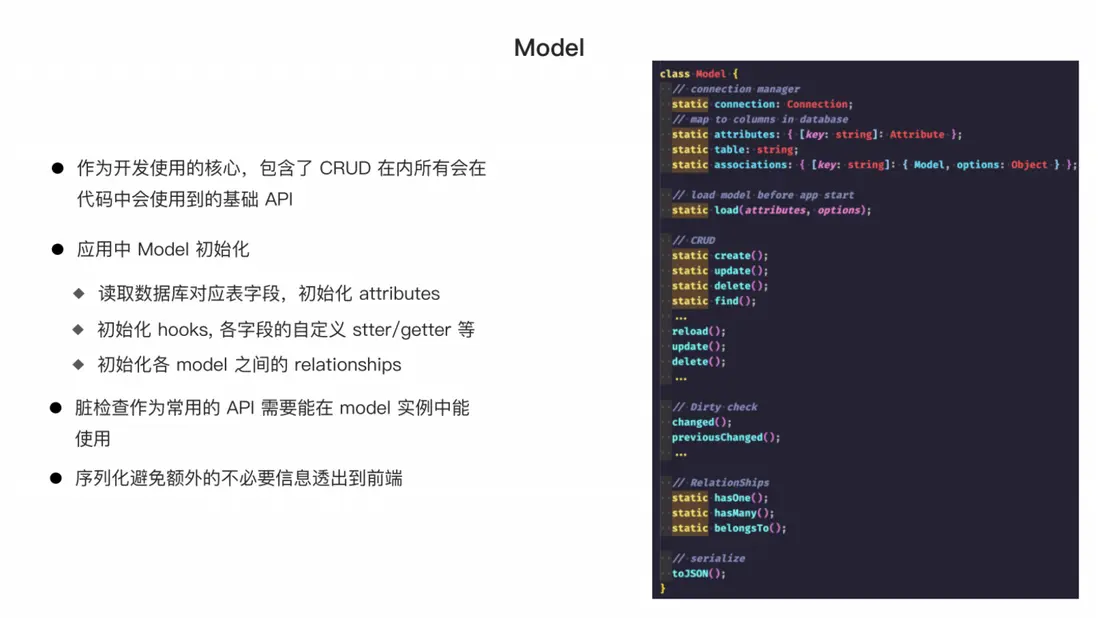 在 Active Record ORM 中,Base Model 是其核心組成部分之一。它包含了 CRUD 在內的所有基礎 API,同時還要能夠讀取用户派生的 model。在 Base Model 中,還有針對數據庫與應用開發語言之間的不同命名習慣的 name 和 column 成員變量。初始化 model 時,還會有用户設置的 Hooks 和 Validation,用户可以自定義 set/get 方法來對某個字段做一些自定義的操作,在設置字段值的時候自動執行相應操作,比如用 text 類型數據庫的字段來存儲 JSON 字符串。此外,base model 還會記錄各個 model 之間的關係,如 has_one、has_many 等關係。