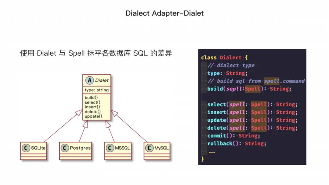 Dialect 需要解析 Spell 表達式,根據方言類型生成特定的 SQL。例如,ORM 需要官方提供支持的MySQL、Postgres、SQL Server和 SQLite 的 Dialect。因此,需要為每種數據庫類型編寫一個dialect。我們可以將 Spell 表達式的解析抽象成標準的接口,這樣開發者就可以實現自己的方言,甚至不僅限於 SQL,還可以是其他類型的查詢語言。這樣我們就可以使用 ORM 的 API 進行各種類型的查詢。