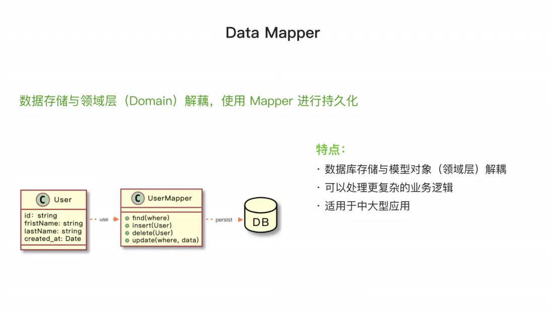 Data Mapper 模式與 Active Record 模式的不同點在於,它將數據存儲層與領域層解耦,模型不再承擔增刪改操作的功能。Data Mapper 可以同時處理一個或多個實體類的應用,例如連表查詢和統一的數據插入操作等業務操作。如果某個業務需要對數據一致性有較強的要求,並涉及多個實體,Data Mapper 可以直接在其中進行操作。