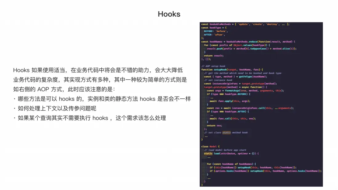 - Hooks 需要有一個原函數,它的入參和返回值類型不能被修改。Hooks 的實現方式有很多種,其中比較直觀的一種方式是面向切面編程。在 ORM 的 API 中,一些 API 可以配置或需要配置 hooks,例如 create、update、destroy 等。