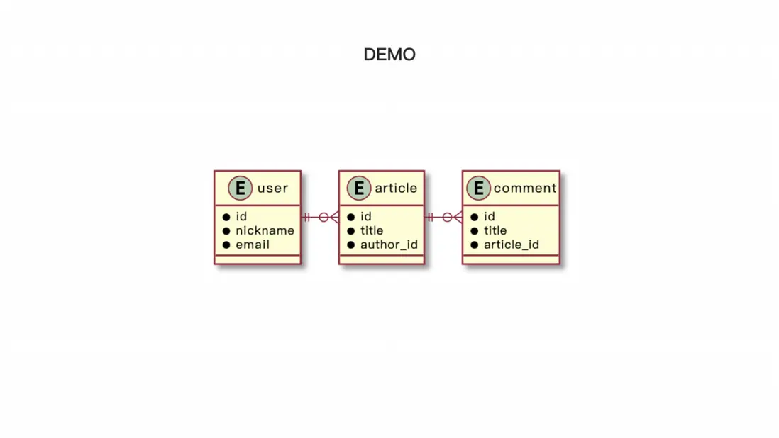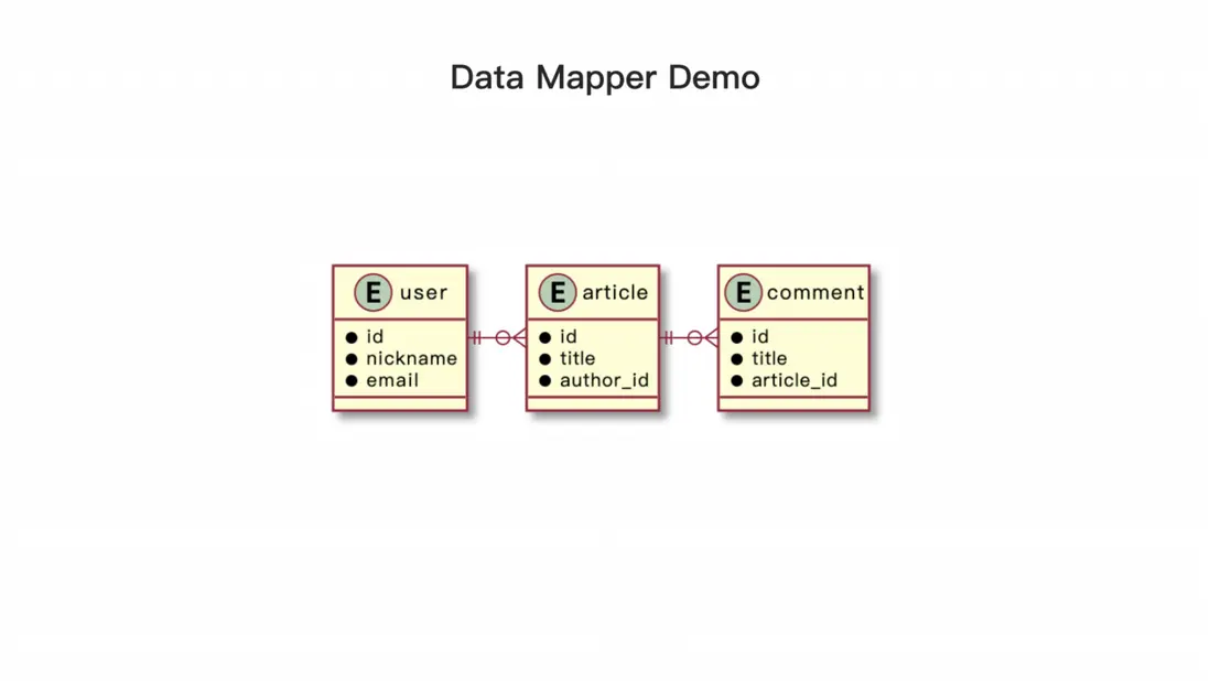 我們之前已經展示了一個屬於 Active Record 類型的ORM demo,因此在這裏就不再多作解釋。接下來,我們將介紹另一種 ORM 類型,即 Data Mapper類型。我們將通過一個 demo 來説明這種類型的 ORM,其中涉及到的模型包括 user、article 和 comment。回顧一下它們之間的關係:每篇文章有一個作者,每個用户可以有多篇文章,每篇文章有多條評論,每條評論只能歸屬於一篇文章。雖然 Data Mapper 類型的 ORM 在 JavaScript 中並不是很流行,但我們將使用一個名為 TypeORM 的常用 ORM 來進行演示。