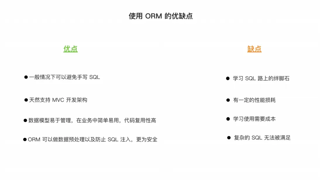 使用 ORM 有很多優點,例如 ORM 會對查詢和更新操作進行數據預處理,從而防止 SQL 注入的風險。另外,ORM 屏蔽了直接編寫 SQL 的細節,使得開發人員不必自己寫 SQL,這對於 SQL 不熟練的人來説是一個好處。此外,由於ORM以模型為基礎,因此支持 MVC 的開發架構,並且可以映射所有數據庫表到內存的 model 中,這有助於組織和複用代碼,避免了到處寫SQL的尷尬處境。