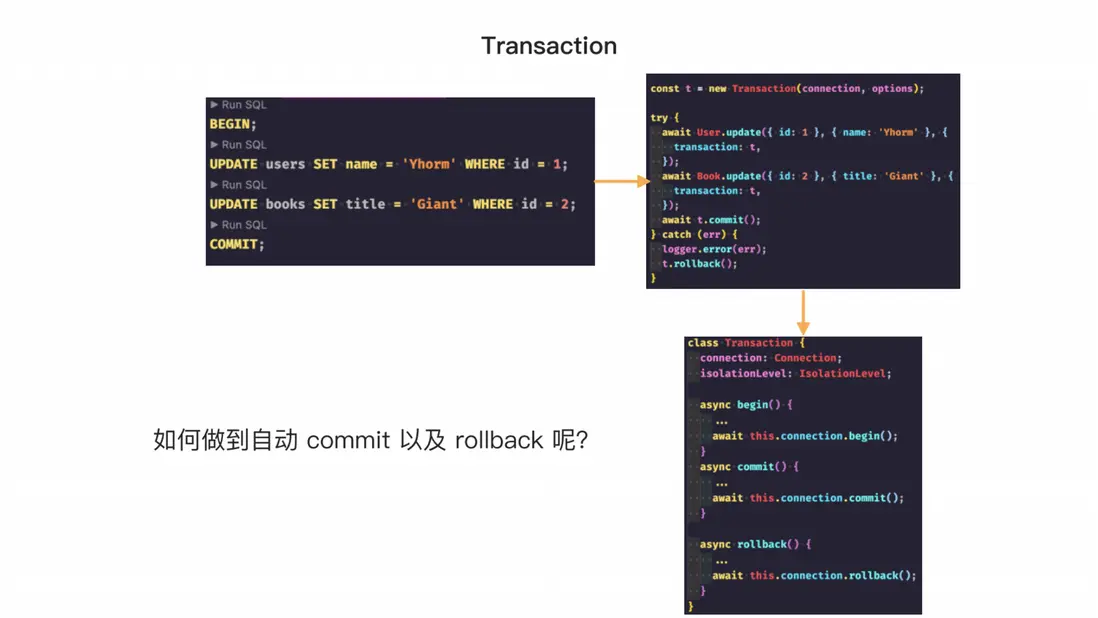接着我們來看一下 Transaction 的簡單實現。在 SQL 語法中實現事務並不複雜,一般使用 begin 開始事務,執行業務 SQL,然後使用 commit 提交或 rollback 回滾事務。在代碼中實現事務,我們可以提供一些基礎的 API,如 begin、commit 和 rollback。在事務開始時,可能需要設置事務的隔離級別。通過這些 API,我們可以保持業務代碼的數據一致性。然而,在實現事務時,我們需要考慮如何自動 commit 和 rollback,而不需要手動調用 commit 和 rollback。