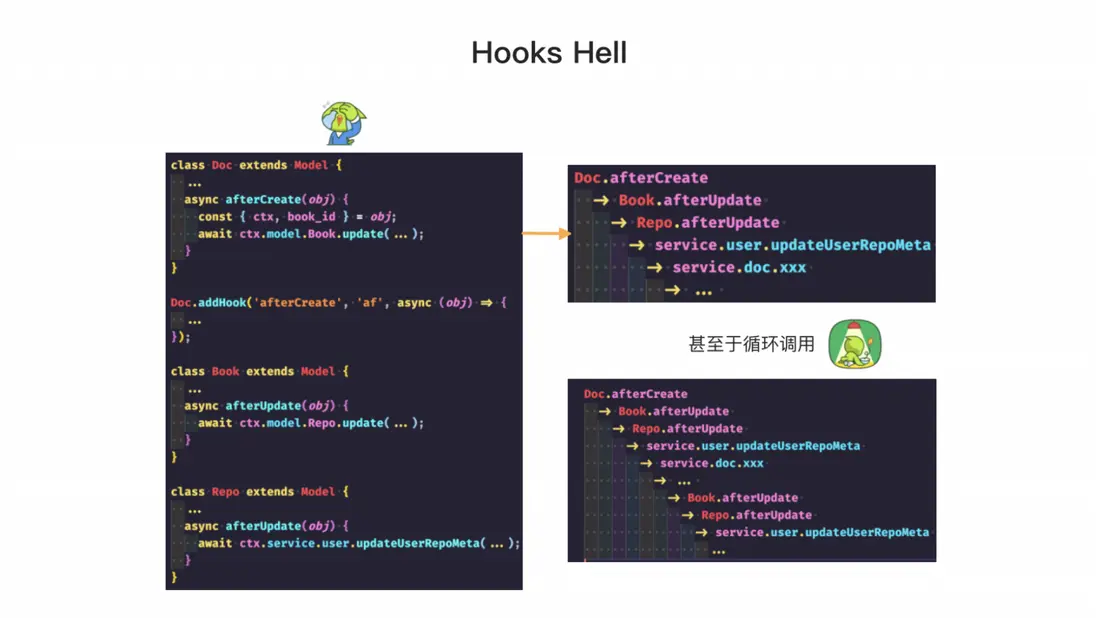 當我們的業務越來越複雜時,例如在更新 Repo 的時候可能需要觸發一些 service 方法,而這些 service 方法可能會在 Hooks 方法中直接調用,導致調用鏈越來越長,越來越複雜。這種不規範的寫法會使得代碼的複雜度非常難以控制,甚至可能出現循環調用等問題,給新手帶來極大的困擾。因此,在使用 Hooks時需要非常謹慎,避免出現類似的問題。使用 Hooks 需要謹慎,雖然在平時使用時會感覺很方便,但是當需要重構或進行技術重構時,就可能會遇到困難,甚至引起災難級事故。