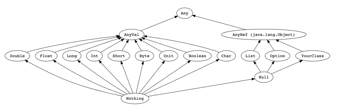 在Scala的數據類型層級結構的底部,還有兩個特殊的數據類型: Nothing 和 Null。其中, Nothing 類型是所有類型的子類型,它沒有任何實例。而 Null 類型是所有引用類型的子類型,它只有一個實例: null。