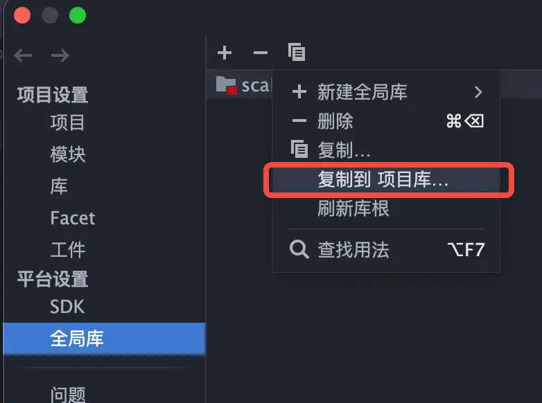 - 右鍵點擊添加到你要使用Scala的項目的項目庫,項目的庫裏就會多出Scala的SDK。