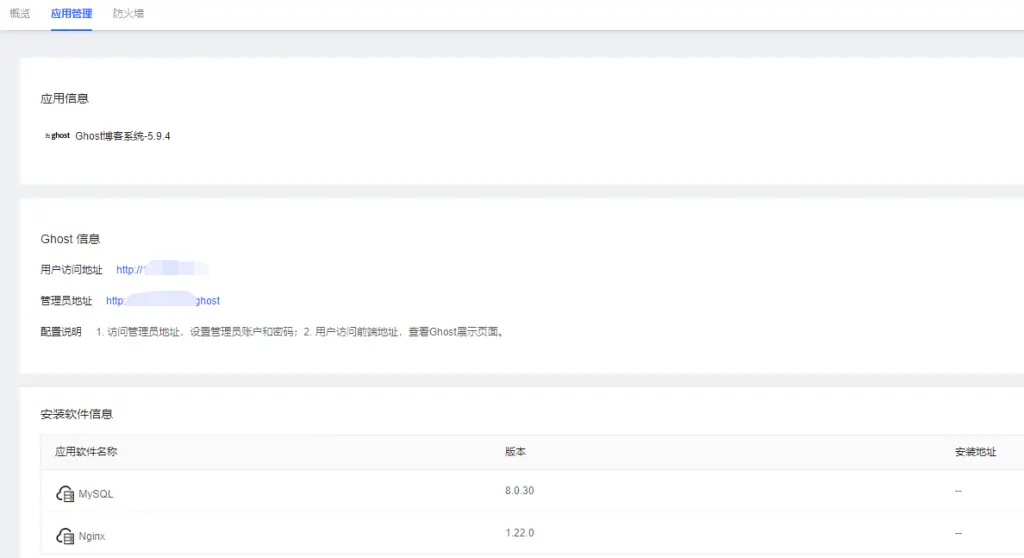 - 切換到應用管理頁面查看應用的詳細信息,獲取Ghost管理員和用户訪問地址