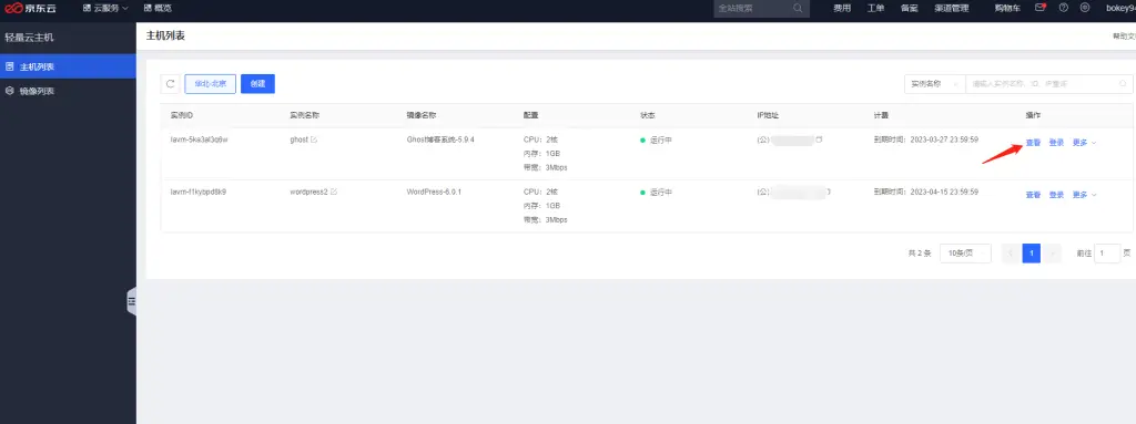 - 支付完成後可以在控制枱看到已購的輕量雲主機,點擊操作中的【查看】按鈕