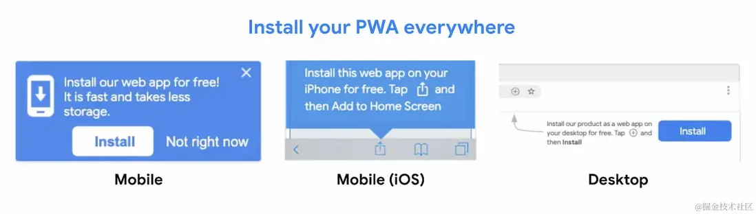 為了讓你的PWA可安裝,需要達到一些條件,當這些條件滿足了之後,你可以提示用户安裝,在不同的平台上做不同的提示,如下圖所示: