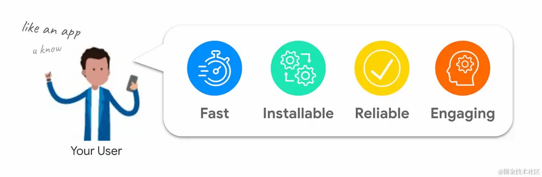 PWA是現代的站點,受益於瀏覽器的支持,結合了用户最愛的原生APP的諸多特性,它利用了一系列的最佳體驗和現代Web Api,可以單獨的集成和實施,根據你的業務來排優先級。