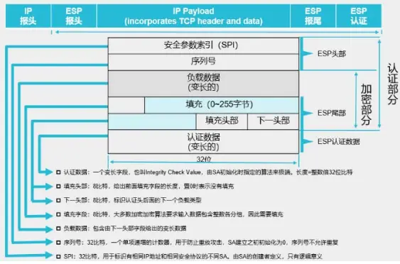 ESP與 AH不同的是 ESP會先把數據段加密,然後再存放到IP報文中,從而達到防止竊聽的目的。ESP 除了在 IP 報頭的後面會加上一個 ESP報頭以外,還會在報文最後加上一個 ESP 報尾,該報尾用來提供加密服務。這樣攻擊者即使獲取了該數據包,在沒解開 ESP 加密的情況下也無法獲知其中的信息。