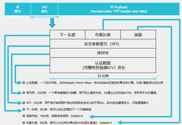 AH 的工作模式是在每一個數據包中的 IP 報頭後添加一個 AH 頭,這個 AH 頭有自己獨特的字段用於提供安全服務,AH 可以保證數據的完整性不被篡改,但不能防止數據被盜竊。AH 使用的 IP 協議號是 51,當IP報文的協議號部分為51 時,代表IP頭後面是一個 AH 報頭。