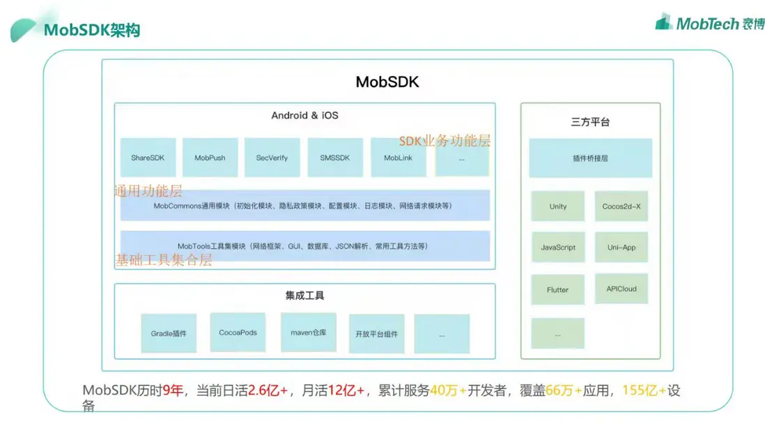 MobTech袤博科技開發者服務歷時9年,現已覆蓋全球近155億+移動端設備,業務覆蓋營銷、金融、商業地理等多個垂直行業,同時為政府業務提供支持。對於App開發者來説,會經常面臨架構選型以及SDK接入的一些痛點和問題,今天從“SDK架構設計”這個主題出發,分享MobTech袤博科技如何系統化打造SDK服務。