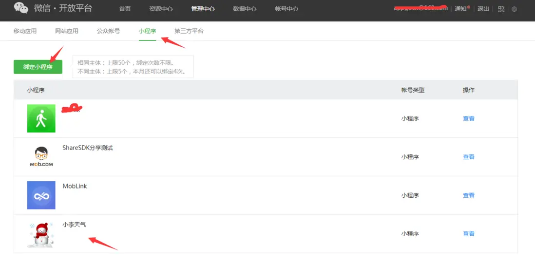 集成完之後做小程序的分享,首先要申請完小程序到微信開放平台綁定到自己的應用,否則無法成功分享, 綁定的位置如下圖:
