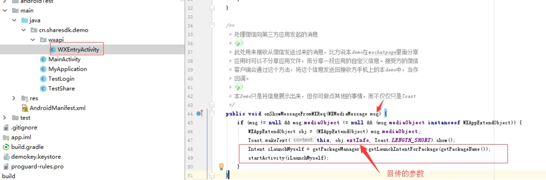 如上所示,配置完回傳的參數,WXEntryActivity.java,在這個類中打開app即可。這樣在小程序中打開app就可以跳轉到app中了,並且可以獲取到回傳的參數。