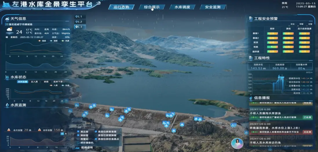 凡拓數創參與的 “左港水庫數字孿生平台” 項目,整合了水文監測、視頻監控、氣象預報等多元數據,構建了水庫運行的數字鏡像,實現了洪水演進模擬與應急預案推演等功能,展示了在數字孿生水利領域的應用能力。