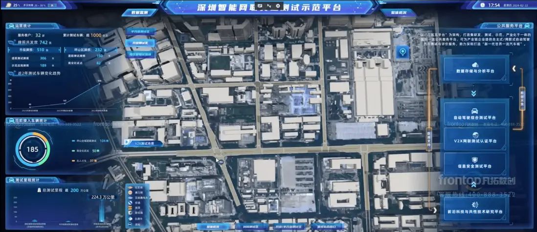 在深圳智能網聯交通測試示範平台建設中,凡拓數創通過數字孿生技術構建了覆蓋 “車-路-雲”一體化測試環境。該平台實現了對智能網聯汽車測試過程的全程數字化映射,為低空經濟等新場景提供了可靠的驗證環境。